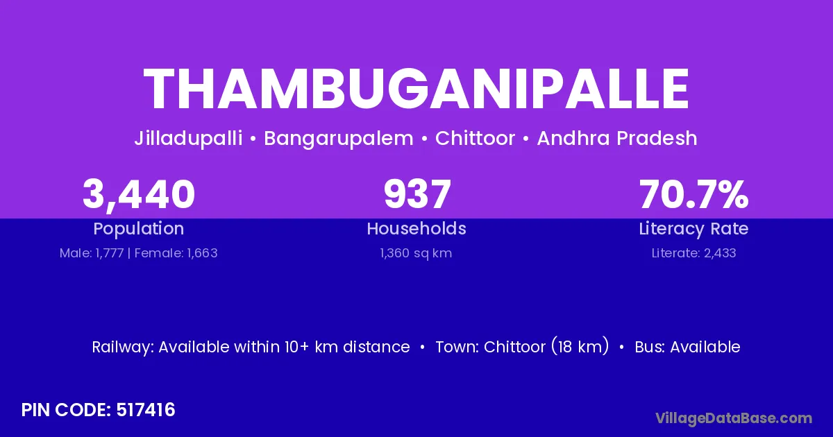 Chittoor (18 km) is the nearest town to Thambuganipalle village for major economic activities and is located approximately 18 km away.