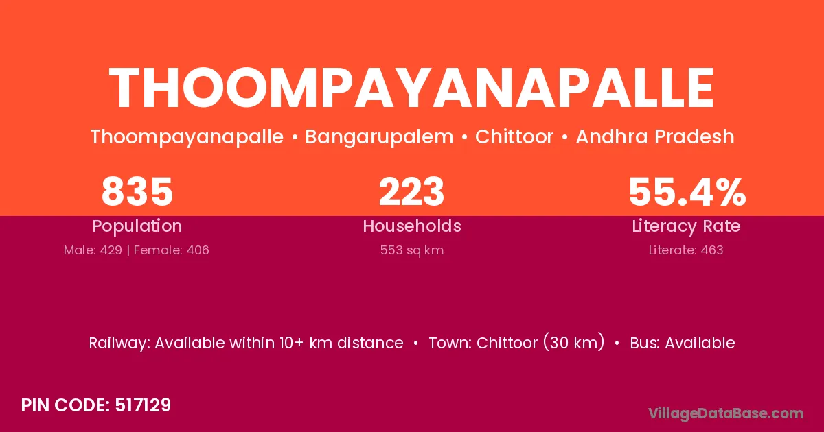 Chittoor (30 km) is the nearest town to Thoompayanapalle village for major economic activities and is located approximately 30 km away.