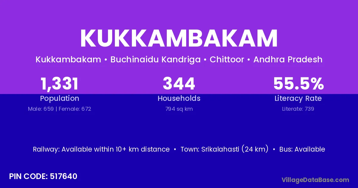 Srikalahasti (24 km) is the nearest town to Kukkambakam village for major economic activities and is located approximately 24 km away.