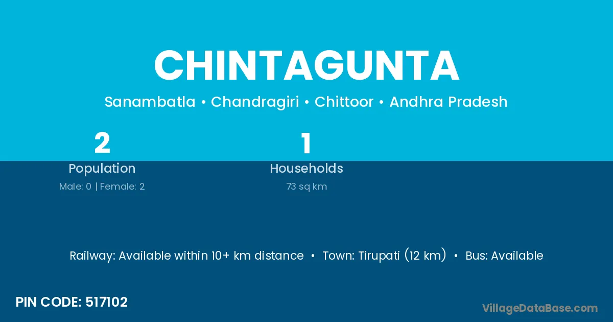 Tirupati (12 km) is the nearest town to Chintagunta village for major economic activities and is located approximately 12 km away.