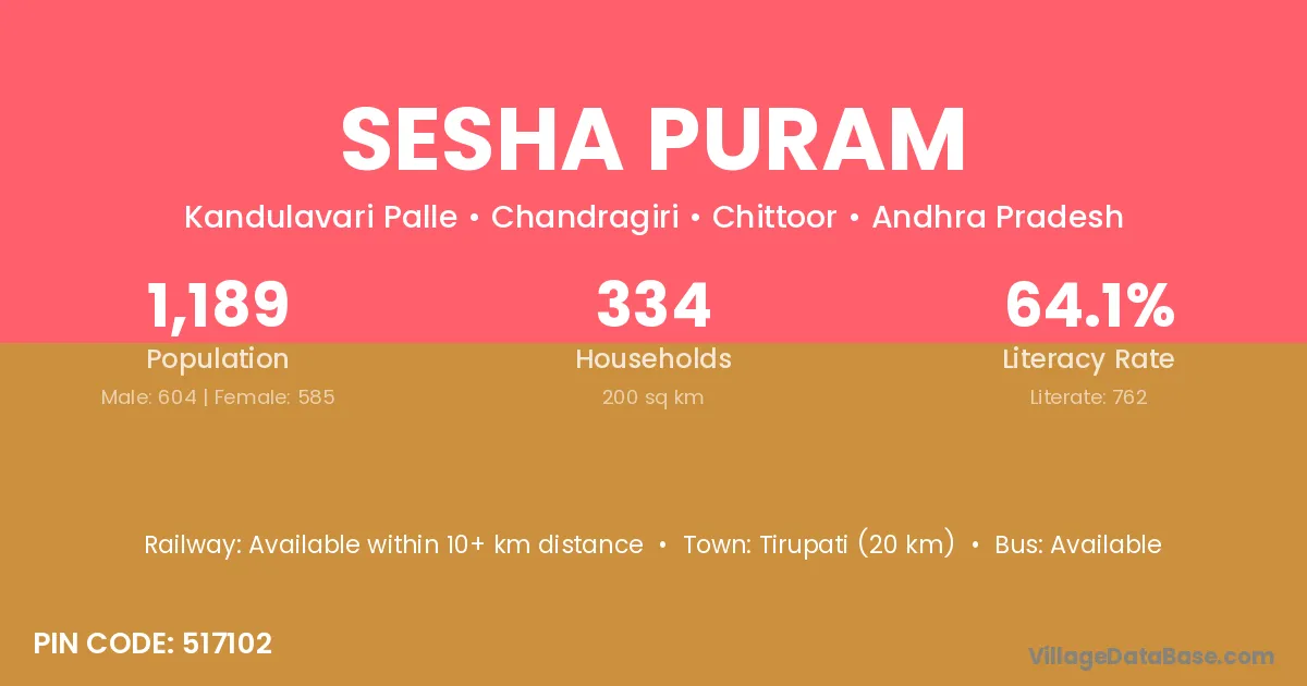 Sesha Puram village has a total population of 1,189 people, of which 604 are males and 585 are females.