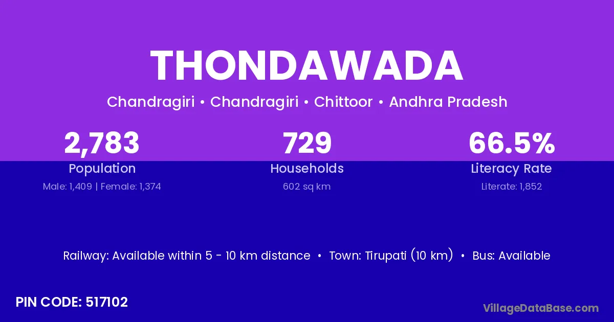 Tirupati (10 km) is the nearest town to Thondawada village for major economic activities and is located approximately 10 km away.