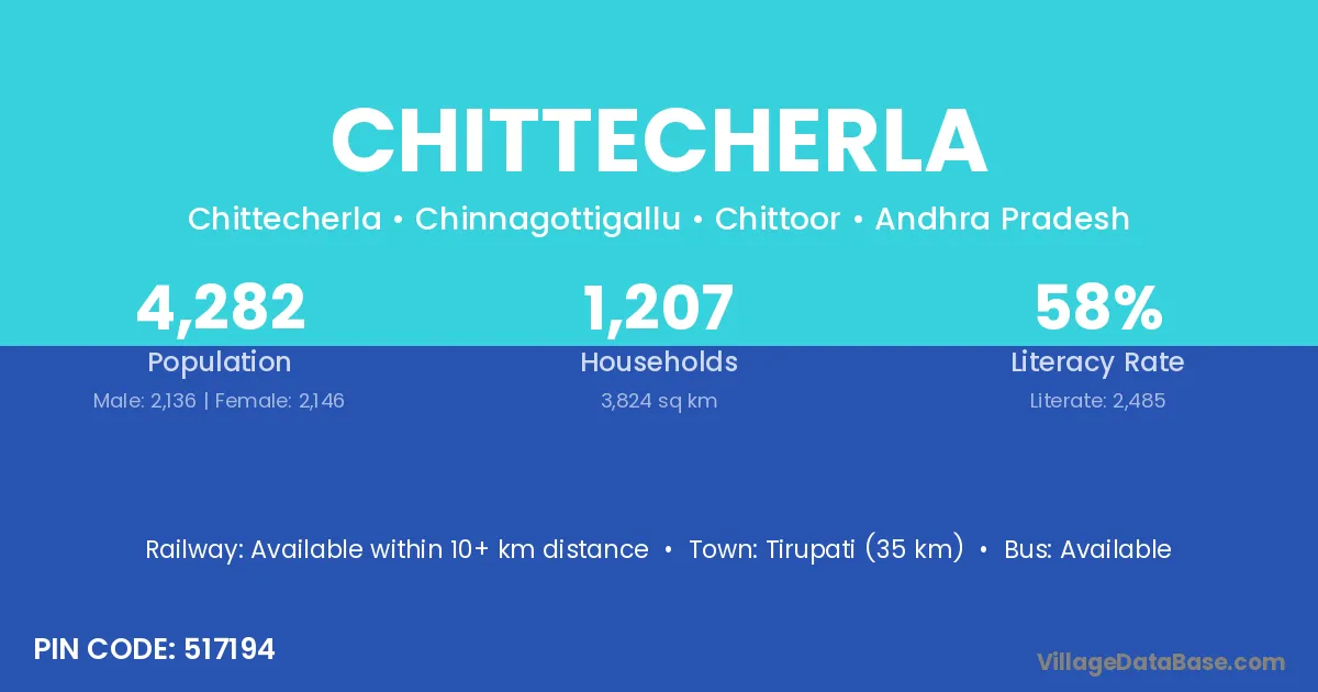 Tirupati (35 km) is the nearest town to Chittecherla village for major economic activities and is located approximately 35 km away.