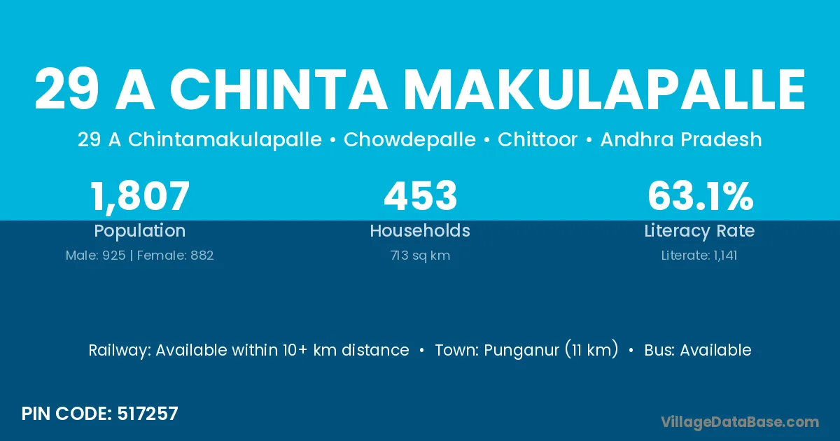 Punganur (11 km) is the nearest town to 29 A Chinta Makulapalle village for major economic activities and is located approximately 11 km away.