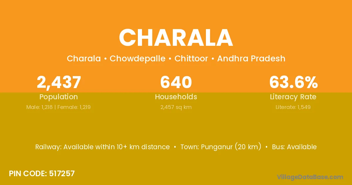 Charala village has a total population of 2,437 people, of which 1,218 are males and 1,219 are females.