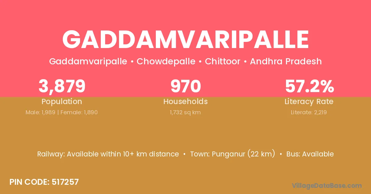 Gaddamvaripalle village has a total population of 3,879 people, of which 1,989 are males and 1,890 are females.