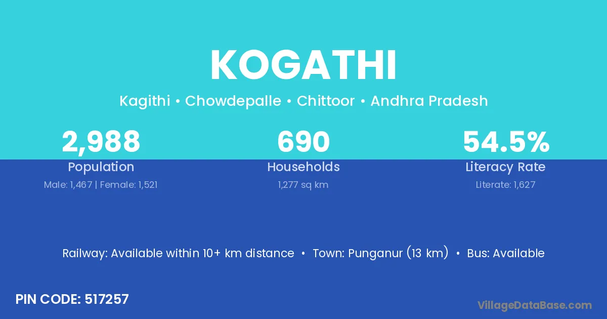 Punganur (13 km) is the nearest town to Kogathi village for major economic activities and is located approximately 13 km away.