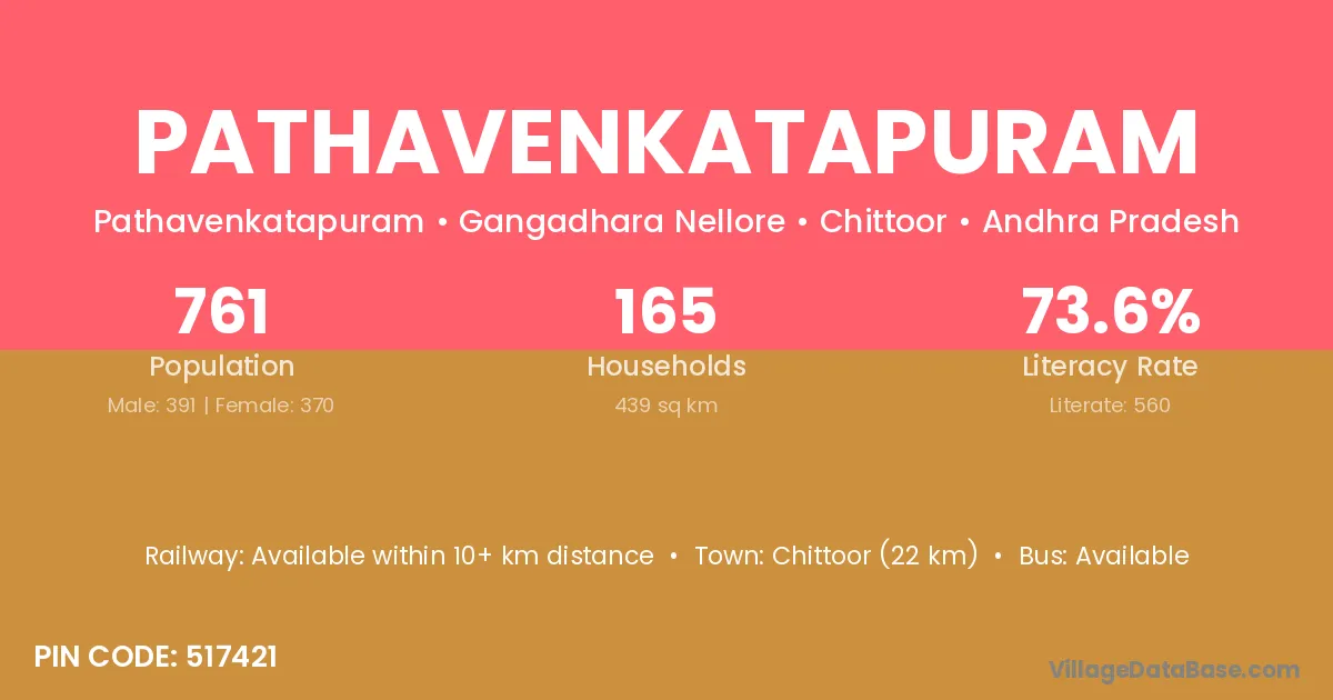 Chittoor (22 km) is the nearest town to Pathavenkatapuram village for major economic activities and is located approximately 22 km away.