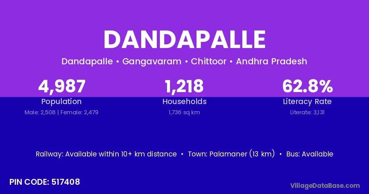 Palamaner (13 km) is the nearest town to Dandapalle village for major economic activities and is located approximately 13 km away.