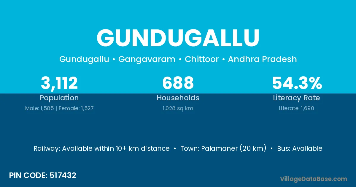 Palamaner (20 km) is the nearest town to Gundugallu village for major economic activities and is located approximately 20 km away.