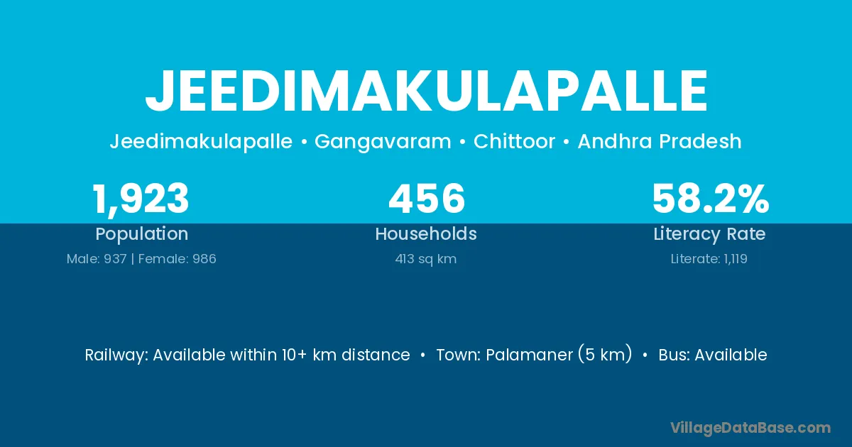 Palamaner (5 km) is the nearest town to Jeedimakulapalle village for major economic activities and is located approximately 5 km away.