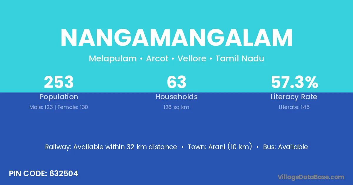 Chittoor (22 km) is the nearest town to Nangamangalam village for major economic activities and is located approximately 22 km away.