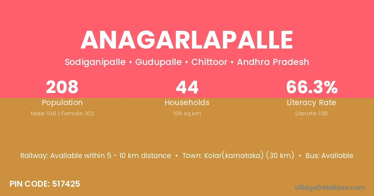 Anagarlapalle village has a total population of 208 people, of which 106 are males and 102 are females.