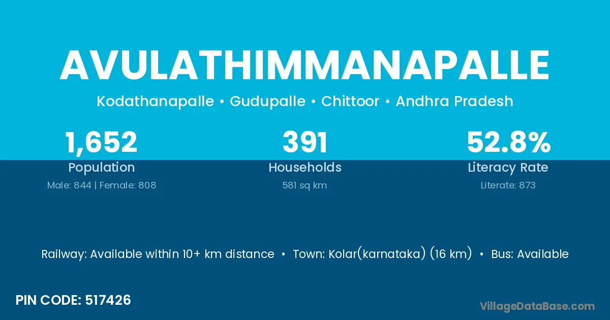 Kolar(karnataka) (16 km) is the nearest town to Avulathimmanapalle village for major economic activities and is located approximately 16 km away.