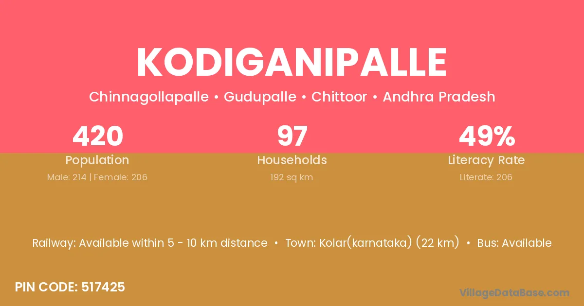 Kodiganipalle village has a total population of 420 people, of which 214 are males and 206 are females.