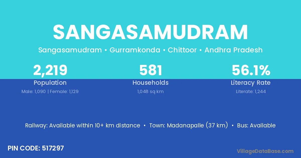 Sangasamudram village has a total population of 2,219 people, of which 1,090 are males and 1,129 are females.