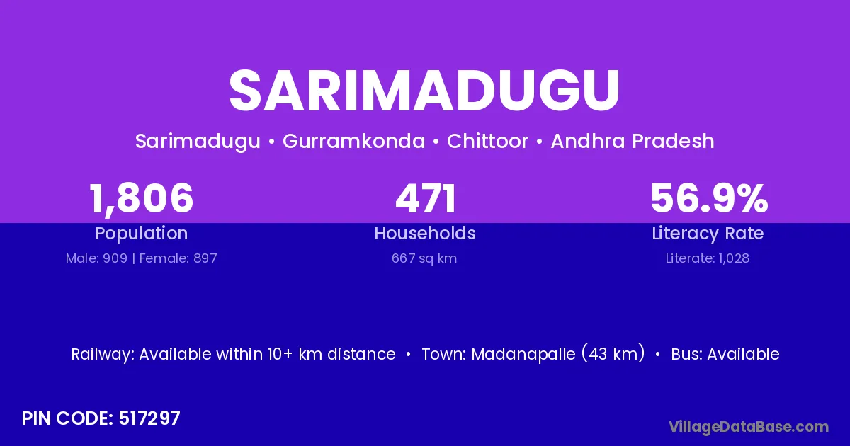 Madanapalle (43 km) is the nearest town to Sarimadugu village for major economic activities and is located approximately 43 km away.