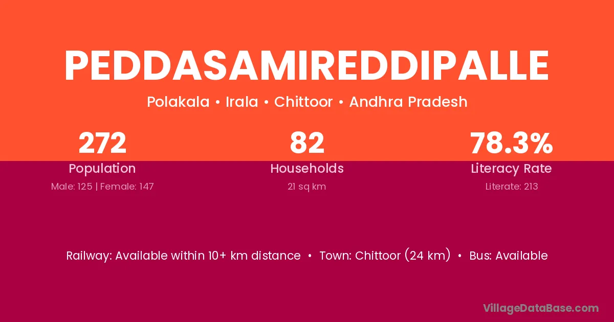 Chittoor (24 km) is the nearest town to Peddasamireddipalle village for major economic activities and is located approximately 24 km away.