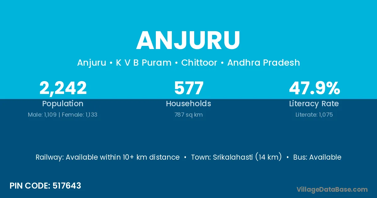 Srikalahasti (14 km) is the nearest town to Anjuru village for major economic activities and is located approximately 14 km away.