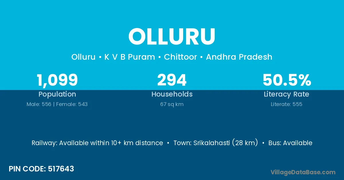 Srikalahasti (28 km) is the nearest town to Olluru village for major economic activities and is located approximately 28 km away.