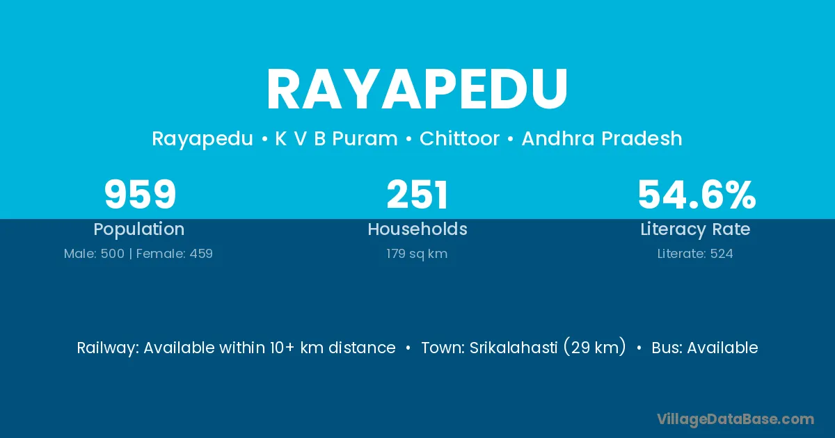 Rayapedu village has a total population of 959 people, of which 500 are males and 459 are females.