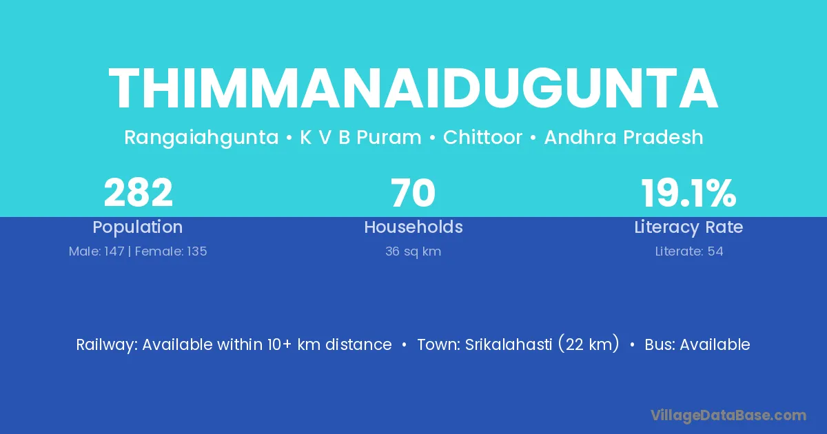 Srikalahasti (22 km) is the nearest town to Thimmanaidugunta village for major economic activities and is located approximately 22 km away.