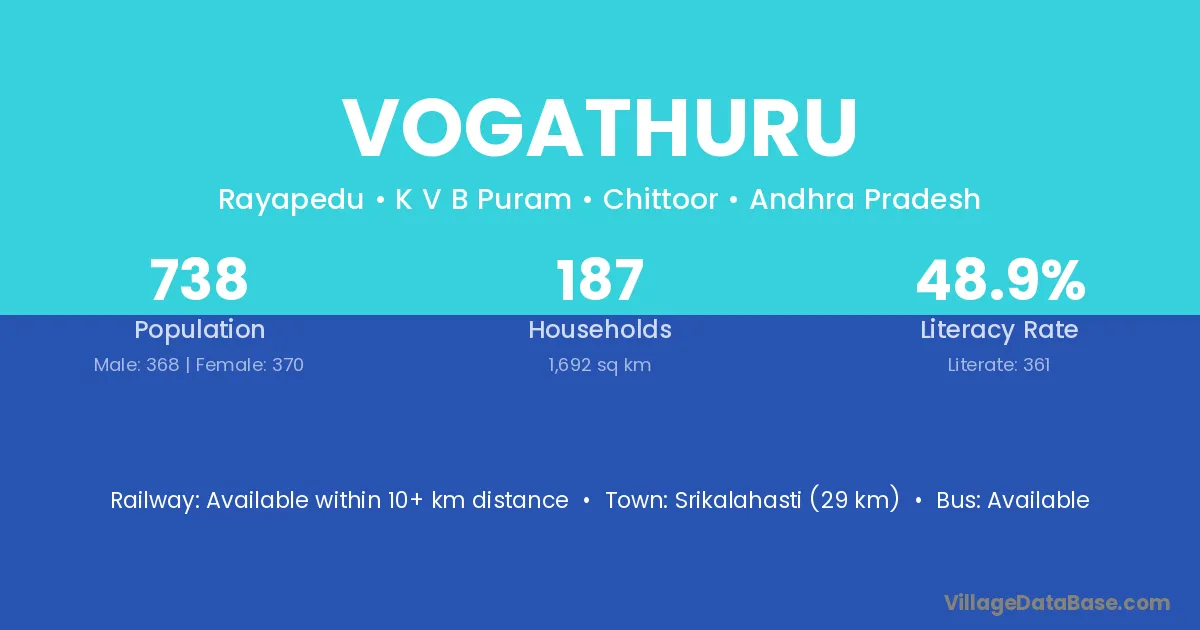 Vogathuru village has a total population of 738 people, of which 368 are males and 370 are females.