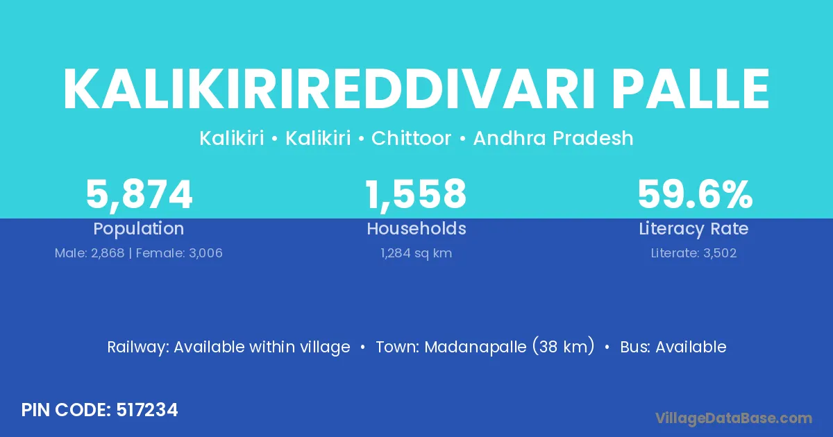 Kalikirireddivari Palle village has a total population of 5,874 people, of which 2,868 are males and 3,006 are females.