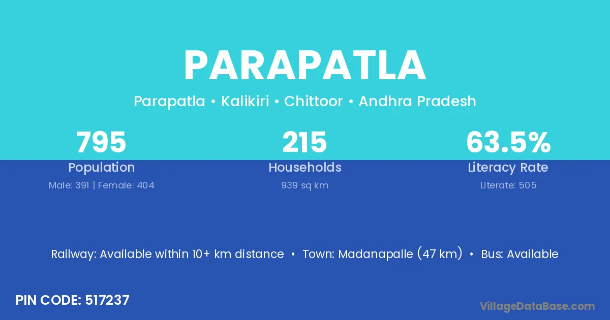 Madanapalle (47 km) is the nearest town to Parapatla village for major economic activities and is located approximately 47 km away.