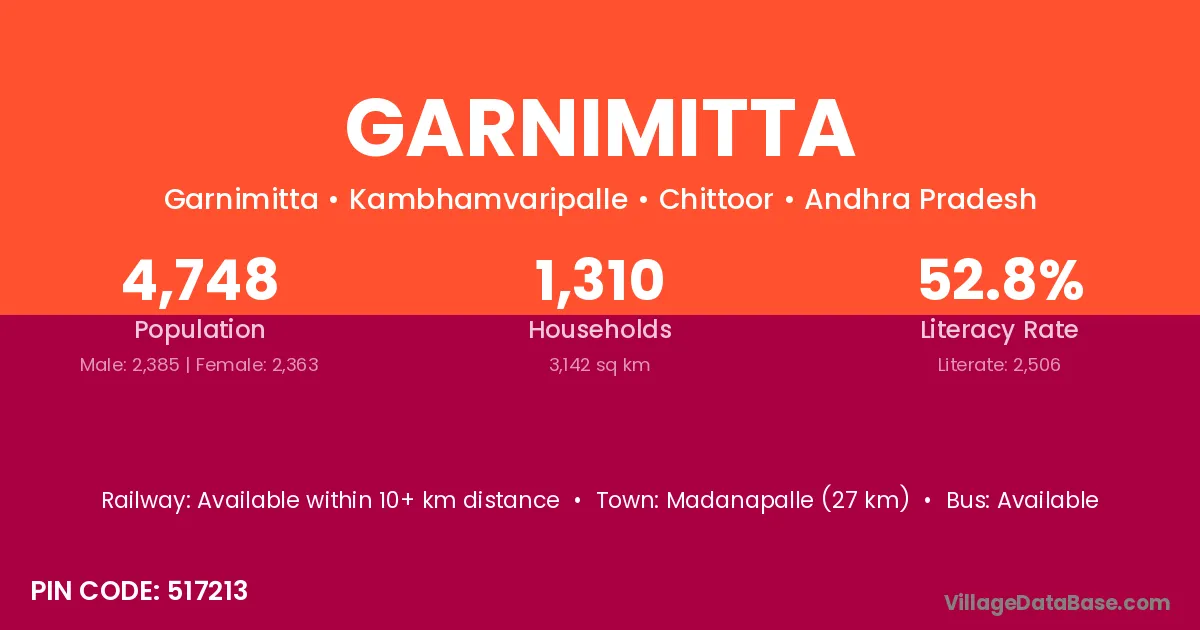 Madanapalle (27 km) is the nearest town to Garnimitta village for major economic activities and is located approximately 27 km away.