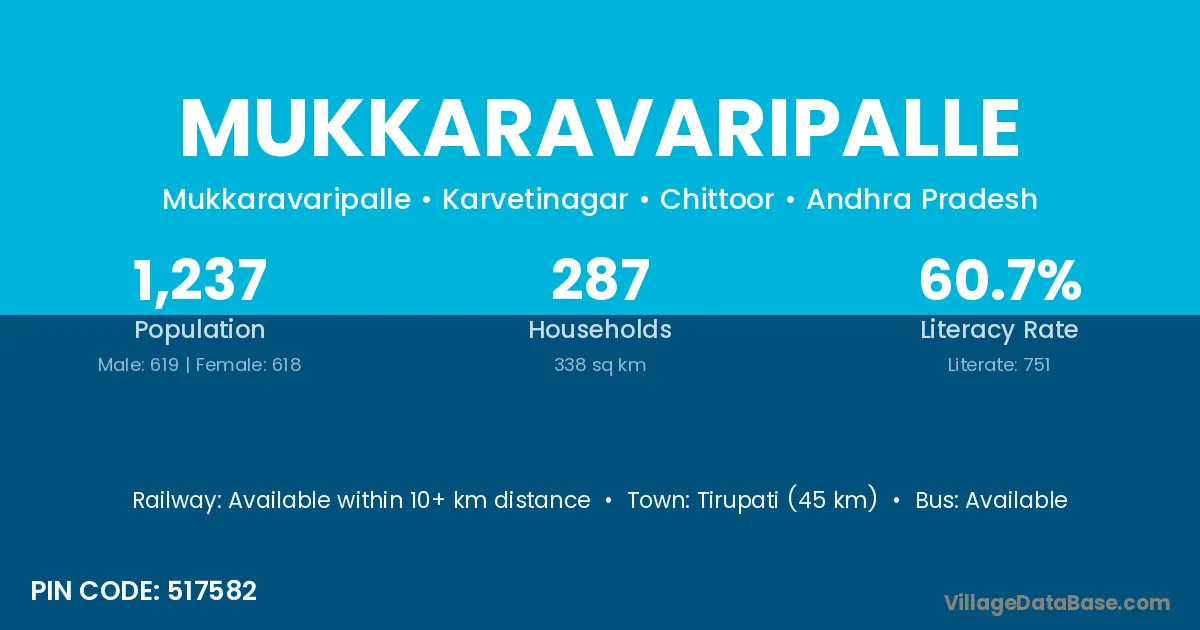 Mukkaravaripalle village has a total population of 1,237 people, of which 619 are males and 618 are females.