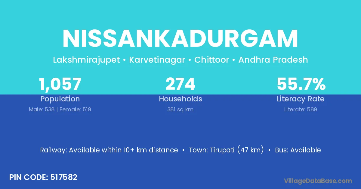 Tirupati (47 km) is the nearest town to Nissankadurgam village for major economic activities and is located approximately 47 km away.