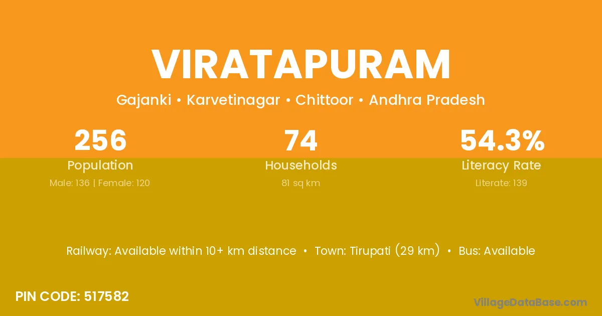 Viratapuram village has a total population of 256 people, of which 136 are males and 120 are females.