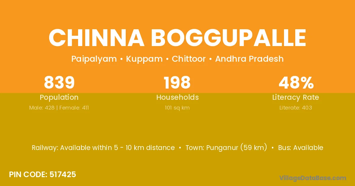Chinna Boggupalle village has a total population of 839 people, of which 428 are males and 411 are females.