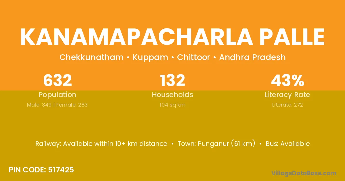 Punganur (61 km) is the nearest town to Kanamapacharla Palle village for major economic activities and is located approximately 61 km away.