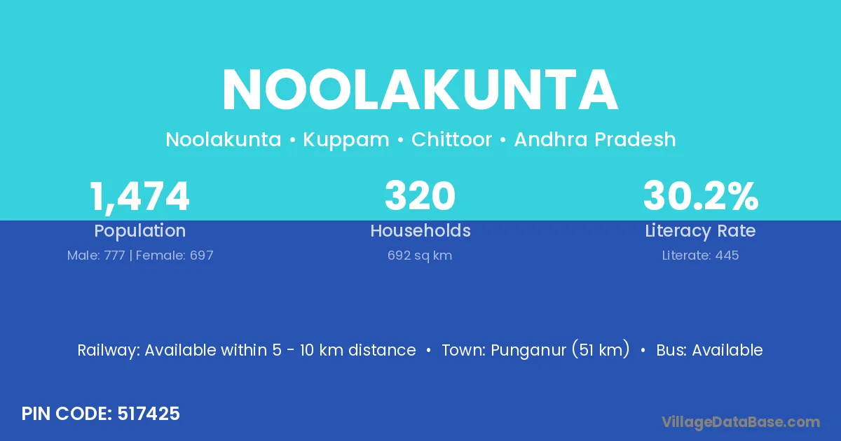 Punganur (51 km) is the nearest town to Noolakunta village for major economic activities and is located approximately 51 km away.