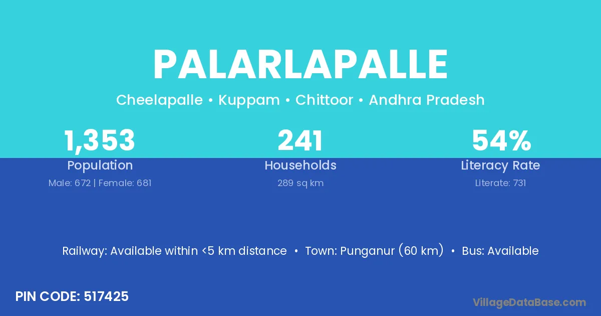Punganur (60 km) is the nearest town to Palarlapalle village for major economic activities and is located approximately 60 km away.