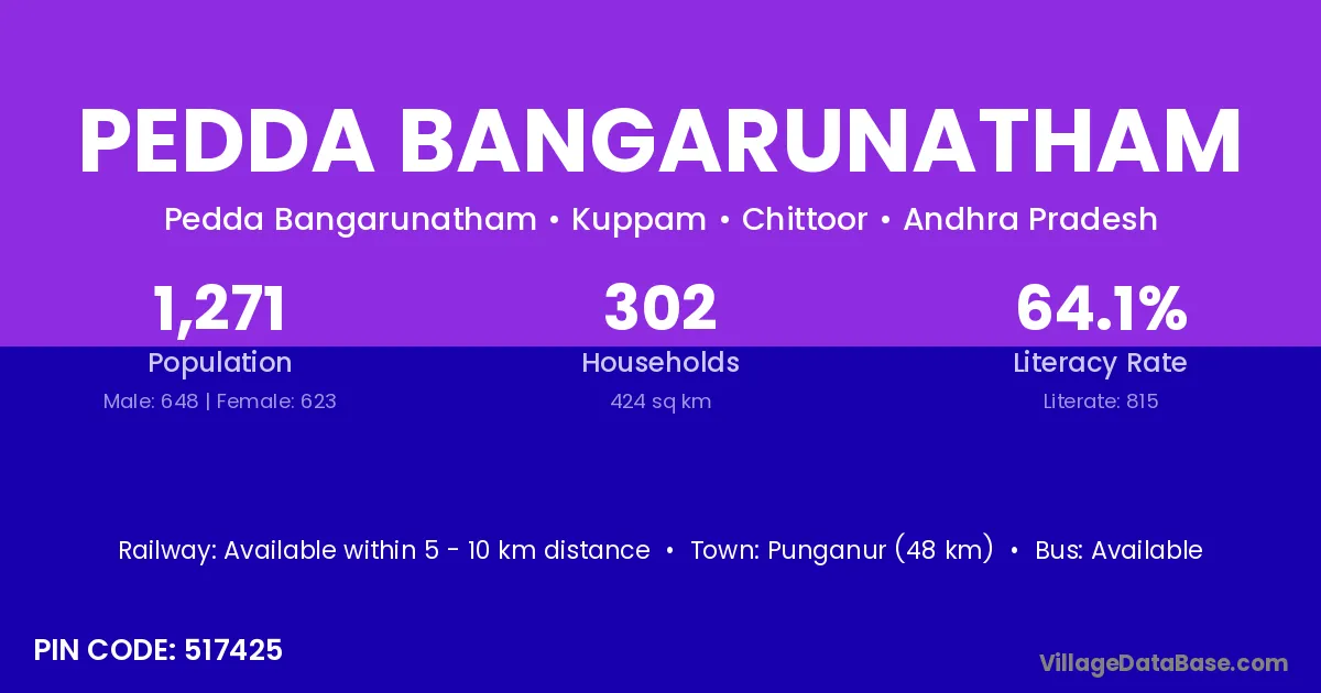 Pedda Bangarunatham village has a total population of 1,271 people, of which 648 are males and 623 are females.