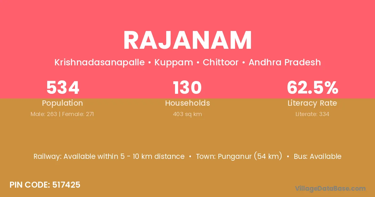 Punganur (54 km) is the nearest town to Rajanam village for major economic activities and is located approximately 54 km away.