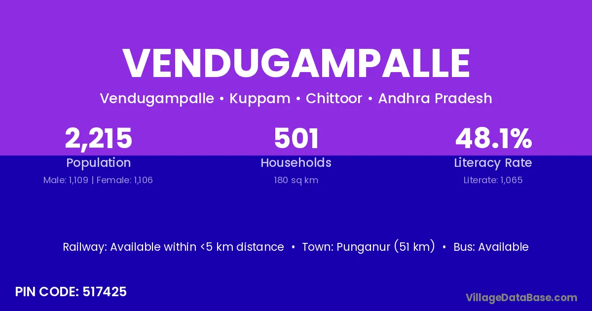 Punganur (51 km) is the nearest town to Vendugampalle village for major economic activities and is located approximately 51 km away.