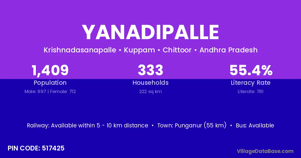 Punganur (55 km) is the nearest town to Yanadipalle village for major economic activities and is located approximately 55 km away.