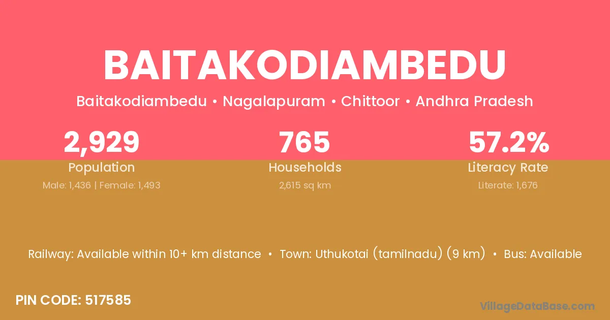 Uthukotai (tamilnadu) (9 km) is the nearest town to Baitakodiambedu village for major economic activities and is located approximately 9 km away.