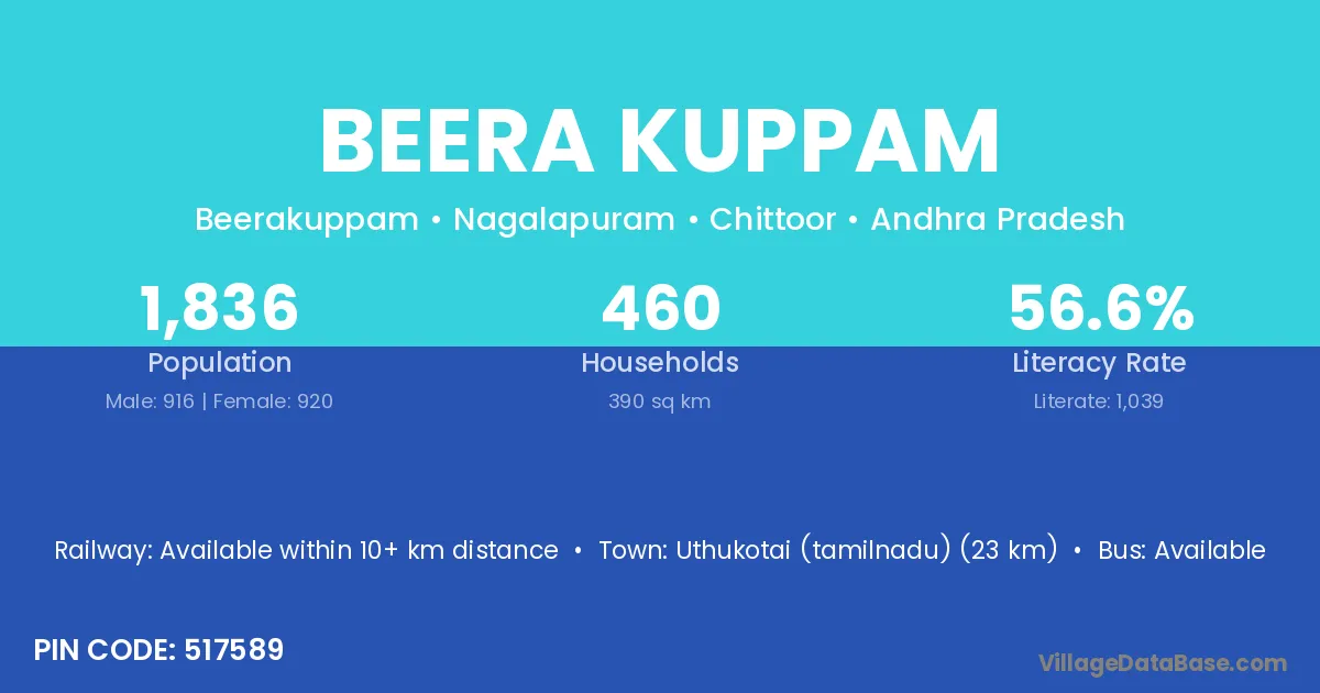 Beera Kuppam village has a total population of 1,836 people, of which 916 are males and 920 are females.