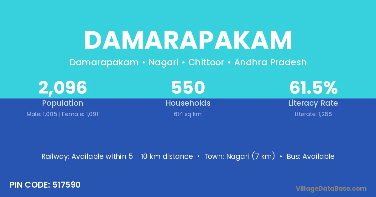 Damarapakam village has a total population of 2,096 people, of which 1,005 are males and 1,091 are females.