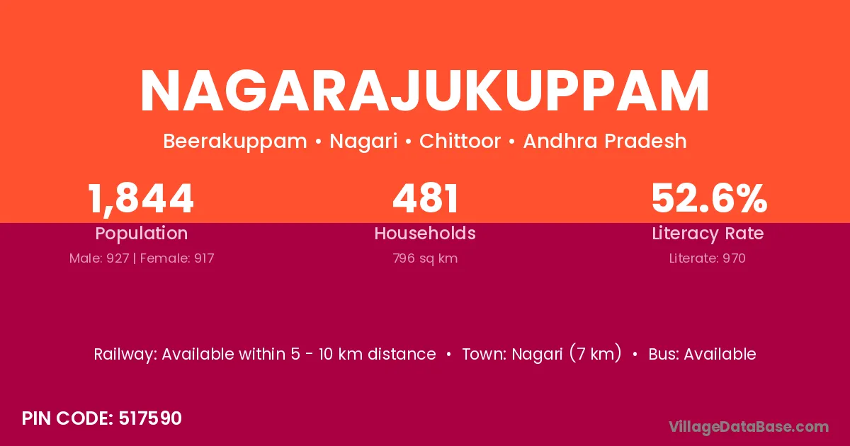 Nagari (7 km) is the nearest town to Nagarajukuppam village for major economic activities and is located approximately 7 km away.
