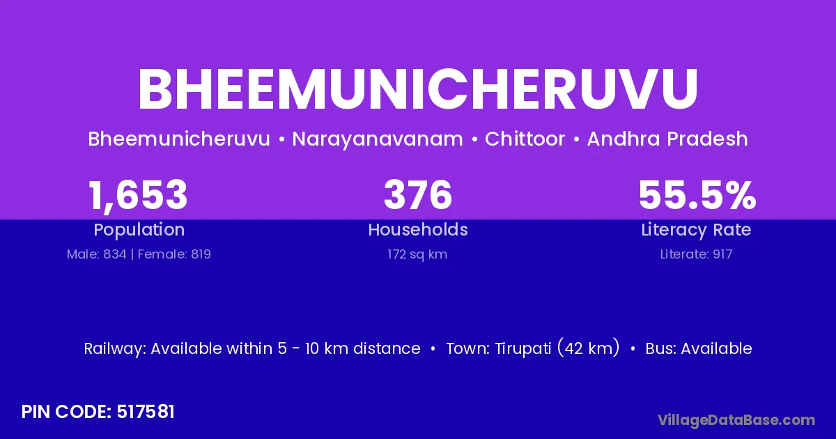 Tirupati (42 km) is the nearest town to Bheemunicheruvu village for major economic activities and is located approximately 42 km away.
