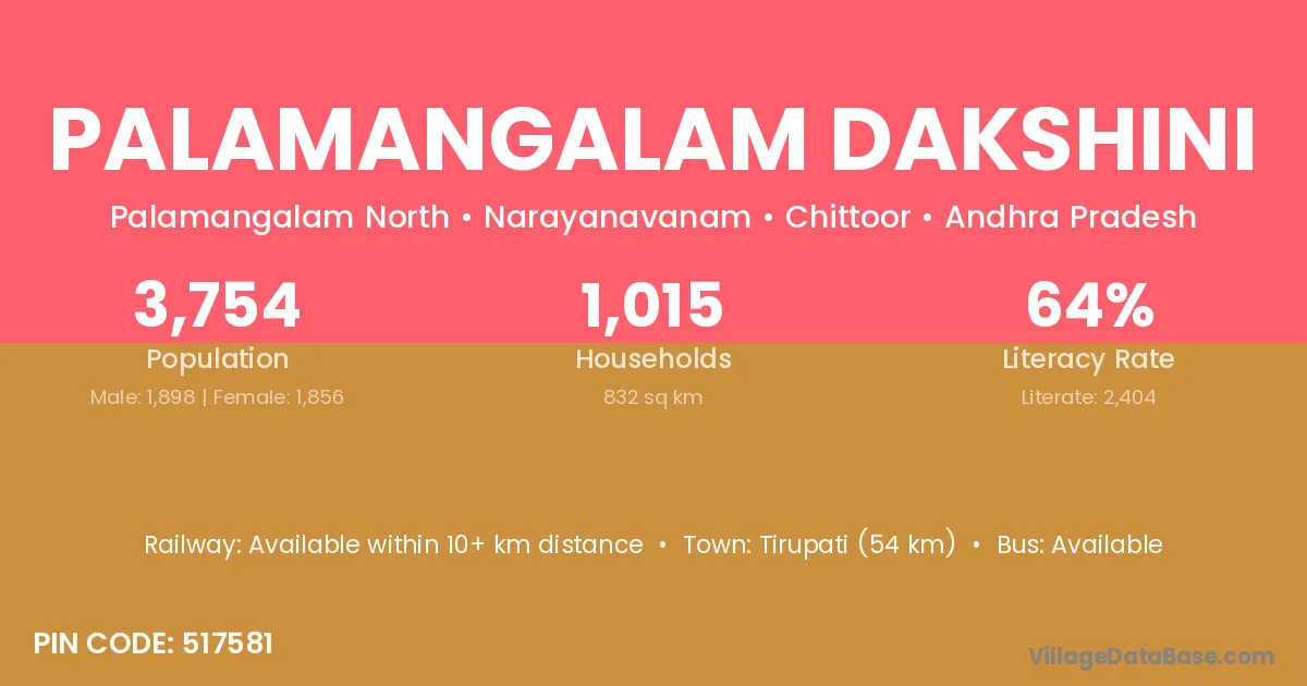 Tirupati (54 km) is the nearest town to Palamangalam Dakshini village for major economic activities and is located approximately 54 km away.