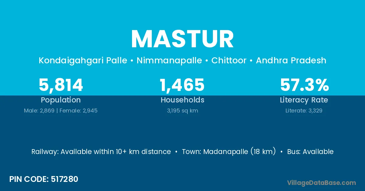 Madanapalle (18 km) is the nearest town to Mastur village for major economic activities and is located approximately 18 km away.