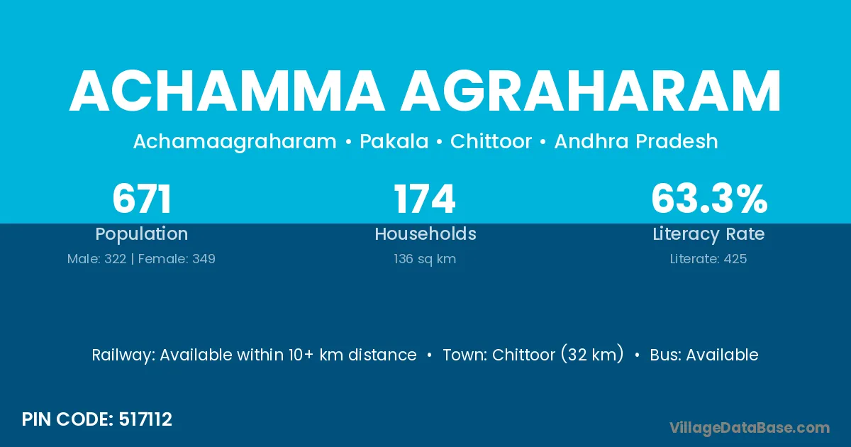 Chittoor (32 km) is the nearest town to Achamma Agraharam village for major economic activities and is located approximately 32 km away.