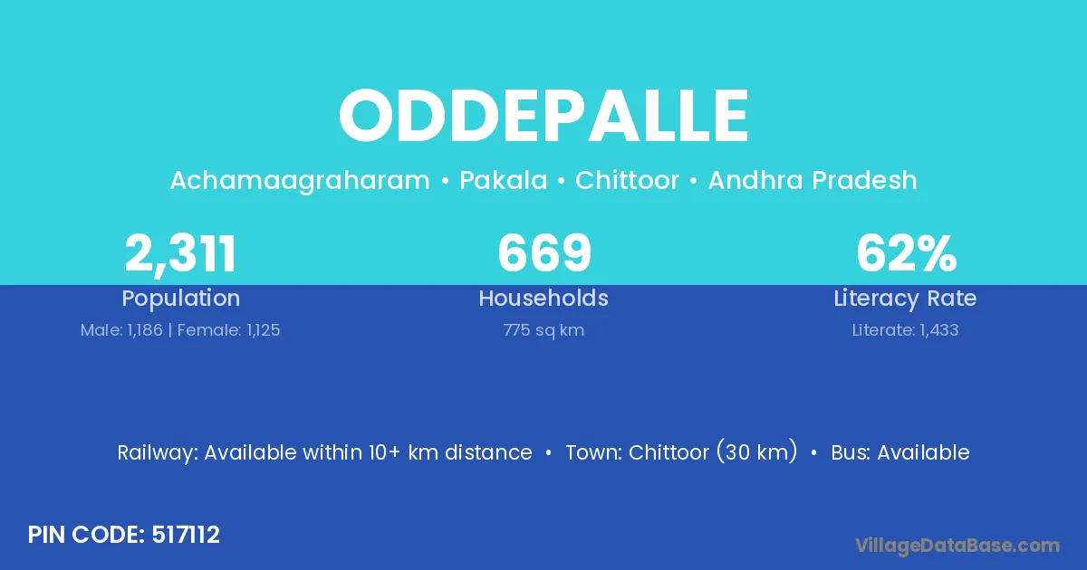 Chittoor (30 km) is the nearest town to Oddepalle village for major economic activities and is located approximately 30 km away.